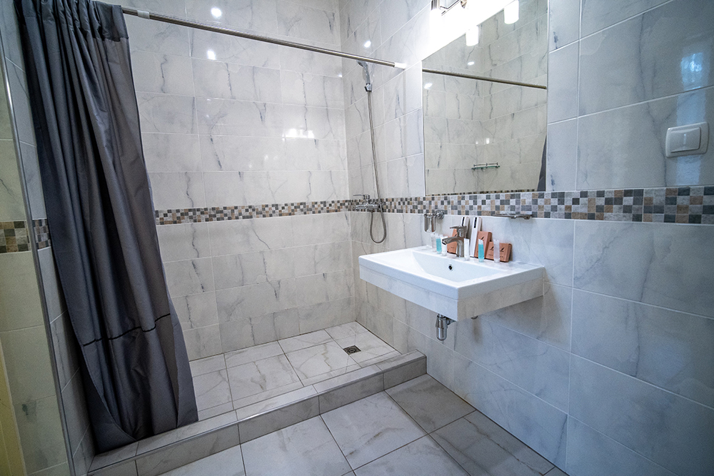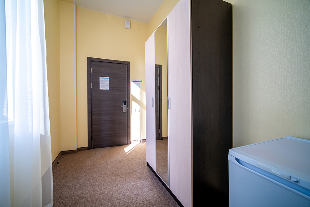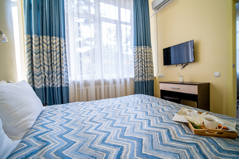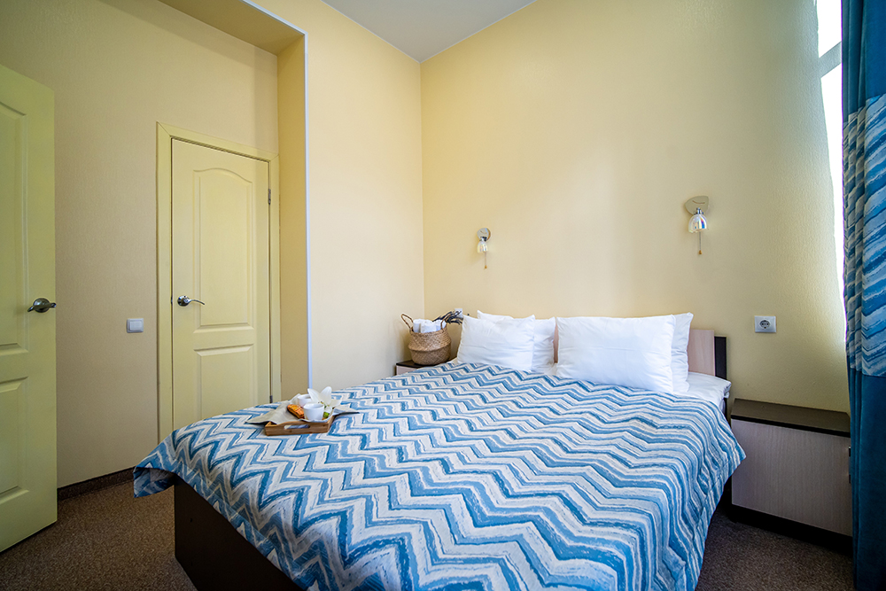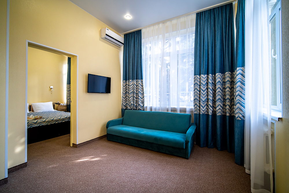 Площадь номера - 40 кв.м. 4 осн. места. 1 доп. место. Мебель: вешалка, диван, зеркало, кровать двуспальная, прикроватные тумбочки, стол, столик журнальный, стулья, тумба багажная, шкаф. Оборудование: кондиционер, сейф, телевизор, холодильник, чайный набор посуды, электрочайник. Санузел: с душем, тапочки, туалетные принадлежности, фен, халат. Сервис: Wi-Fi бесплатно, смена полотенец, смена постельного белья, уборка номера.