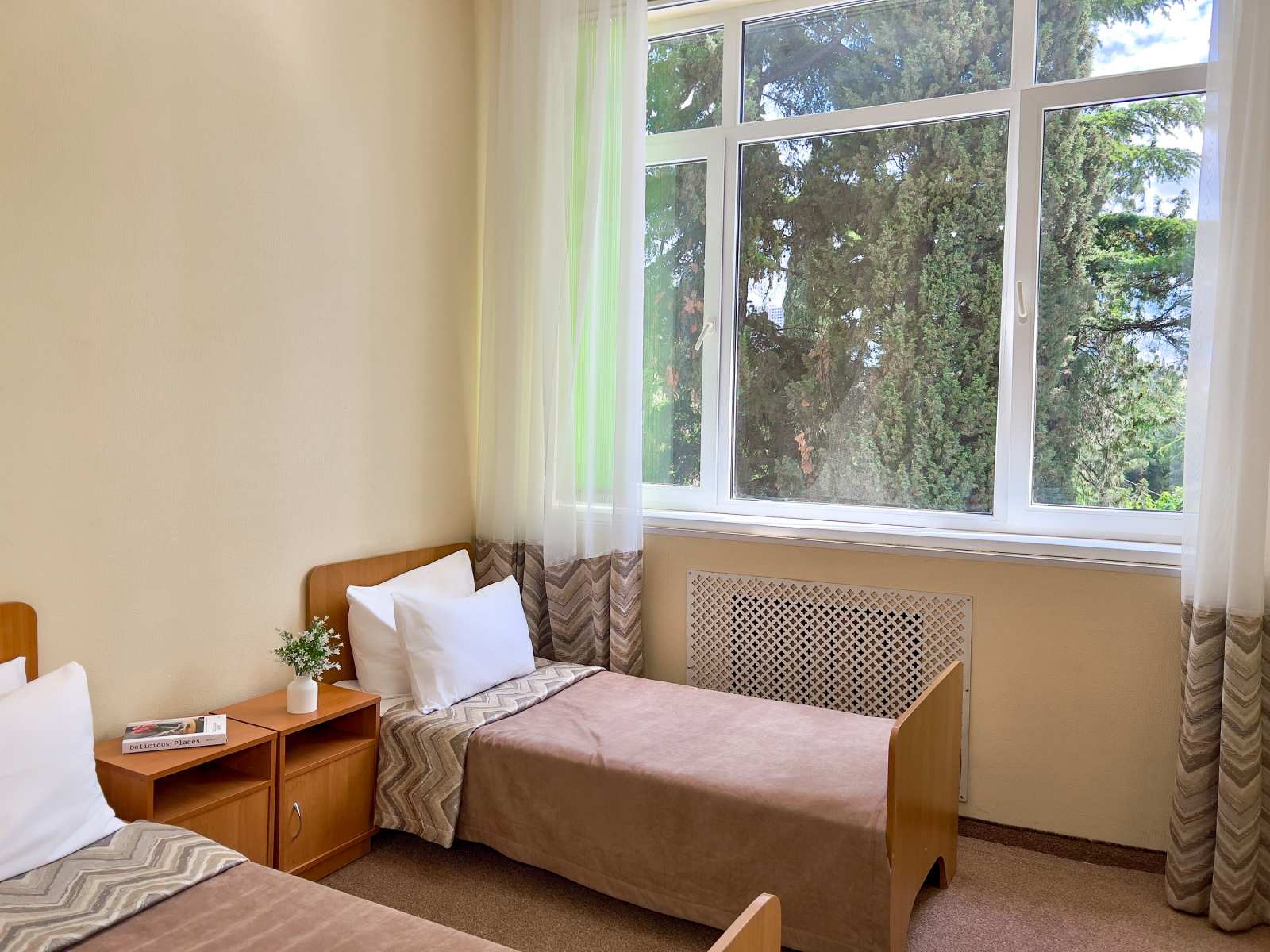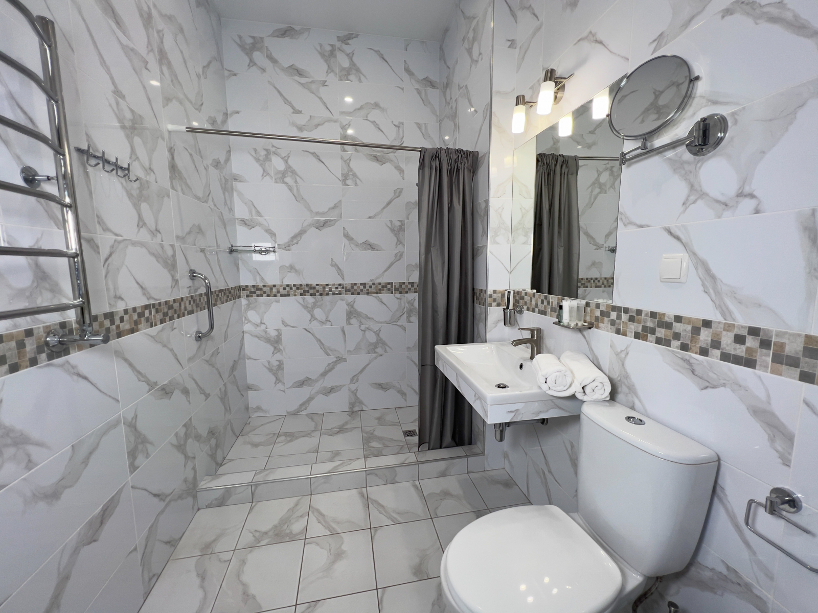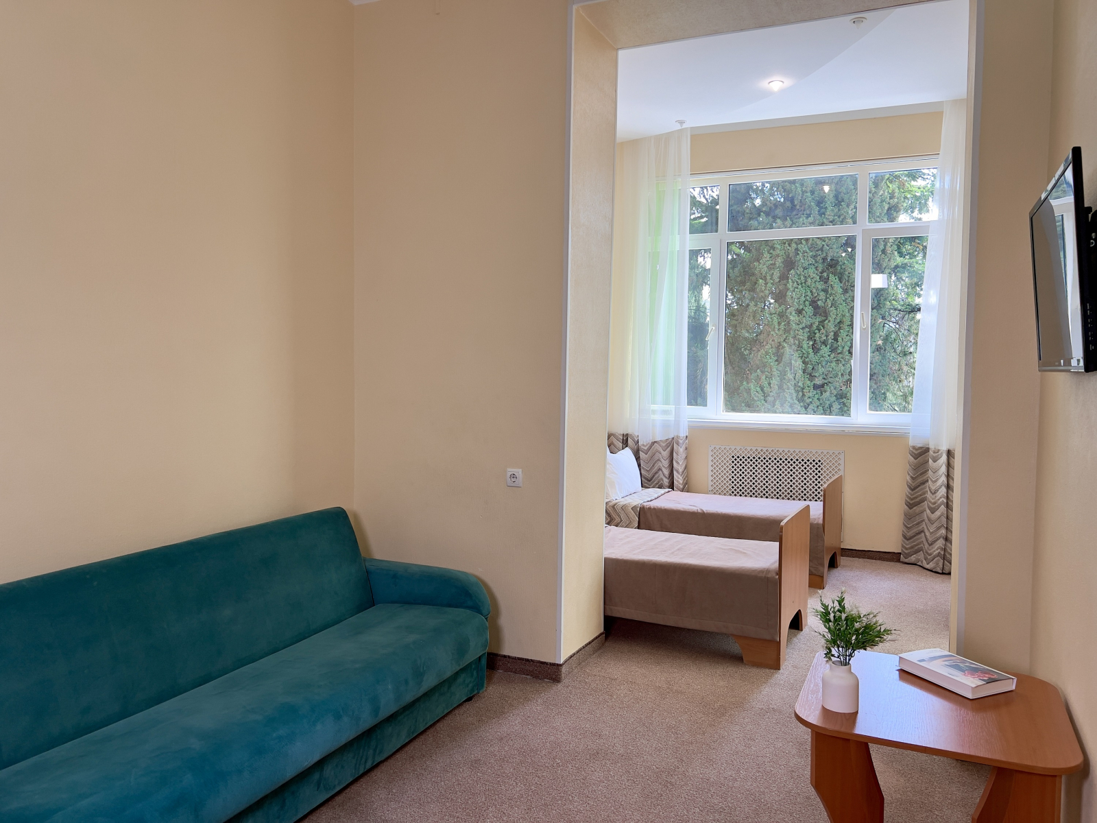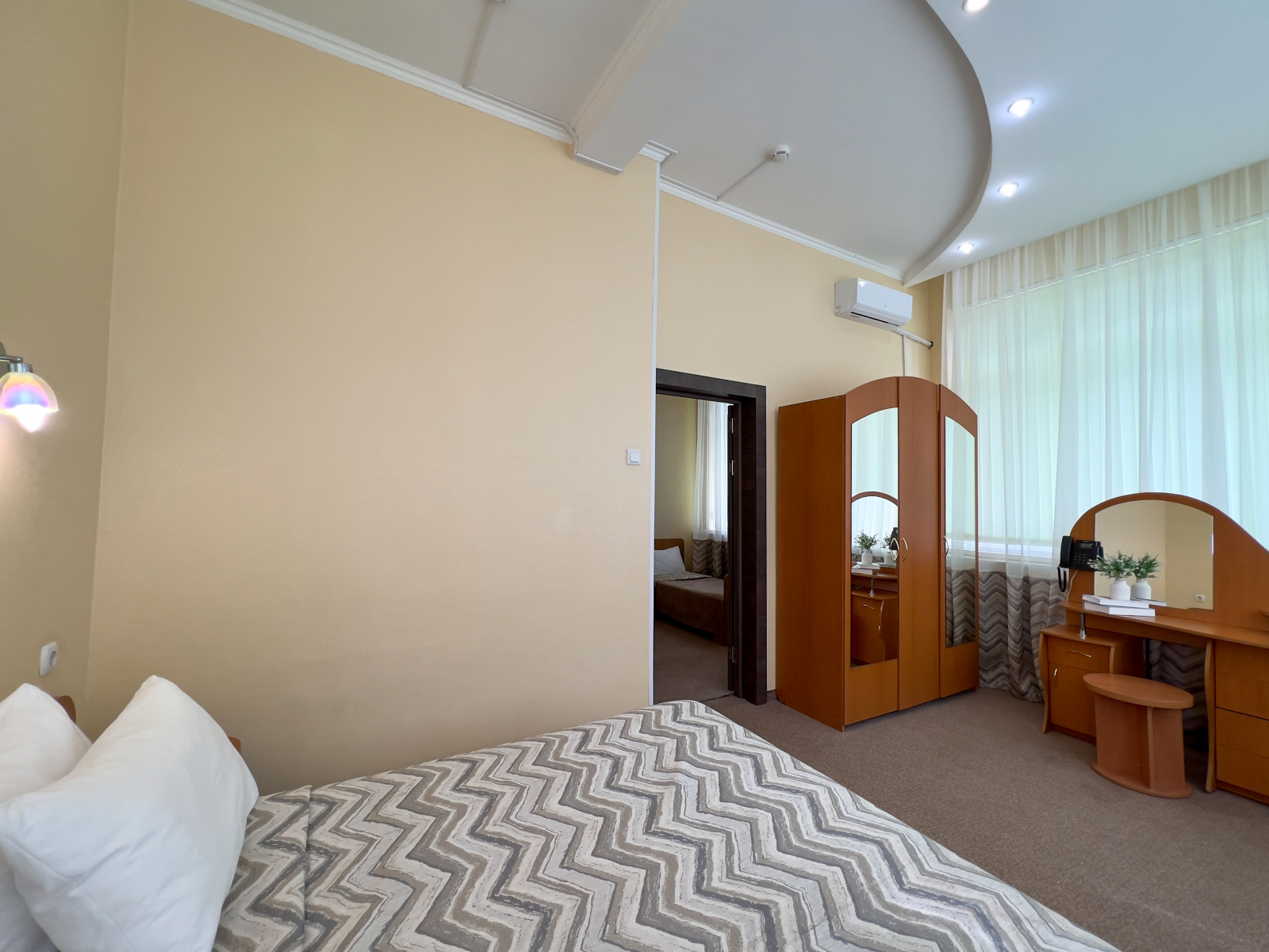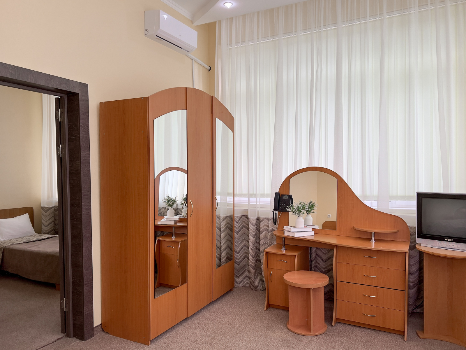 Площадь номера - 45-50 кв.м. 5 осн. мест. 1 доп. место. Мебель: вешалка, диван, зеркало, кресла, кровати односпальные, кровать двуспальная, прикроватные тумбочки, стол, столик журнальный, стулья, шкаф. Оборудование: кондиционер, сейф, телевизор, телефон, холодильник, чайный набор посуды, электрочайник. Санузел: с душем или ванной, тапочки, туалетные принадлежности, фен, халат. Сервис: Wi-Fi бесплатно, смена полотенец, смена постельного белья, уборка номера, услуги внутренней телефонной связи.