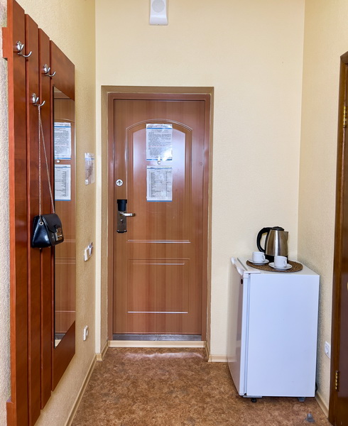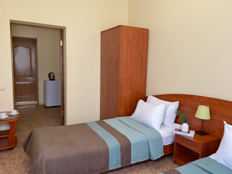 Площадь номера - 18 кв.м. 2 осн. места. 1 доп. место. Мебель: вешалка, зеркало, кровати односпальные, прикроватные тумбочки, столик журнальный, стулья, шкаф. Оборудование: кондиционер, плита электрическая, сейф, телевизор, холодильник, чайный набор посуды. Санузел: с душем, туалетные принадлежности, фен. Сервис: Wi-Fi бесплатно, смена полотенец, смена постельного белья, уборка номера.