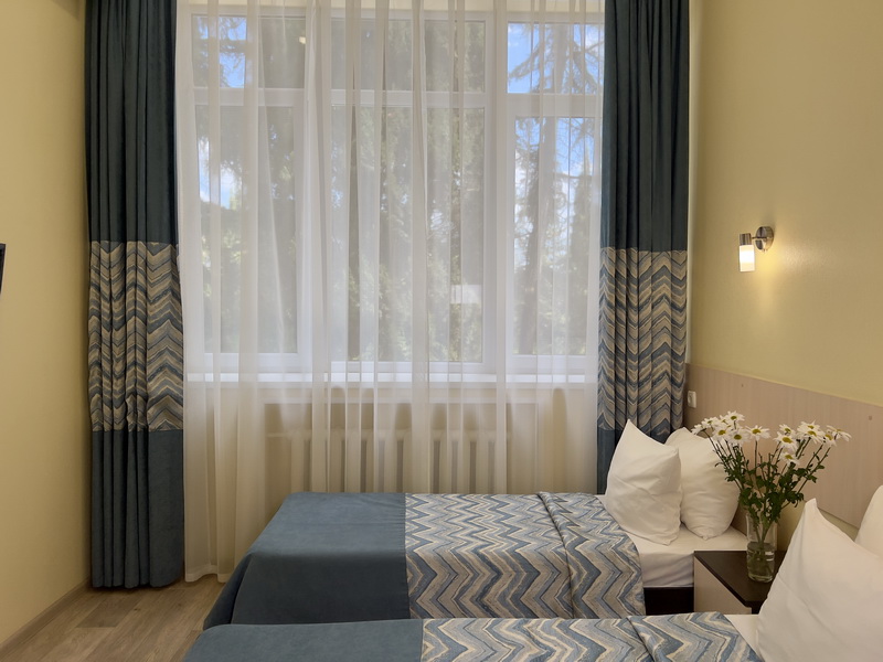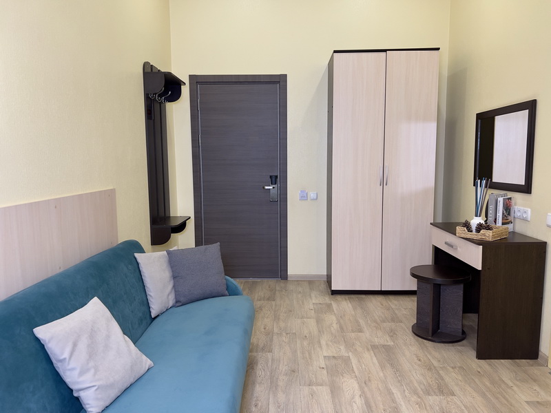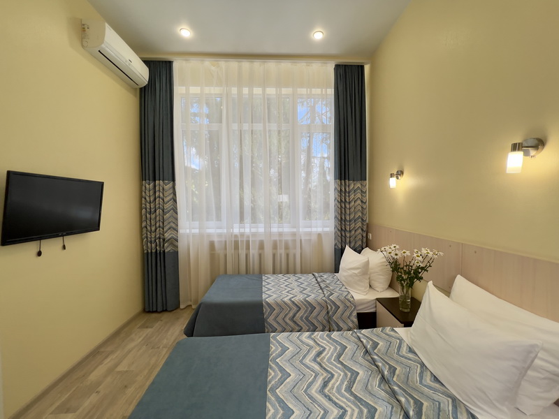 Площадь номера - 25 кв.м. 4 осн. места. 1 доп. место. Мебель: вешалка, диван, зеркало, кровати односпальные, прикроватные тумбочки, стол, столик журнальный, стулья, шкаф. Оборудование: кондиционер, сейф, телевизор, холодильник, чайный набор посуды, электрочайник. Санузел: с душем, тапочки, туалетные принадлежности, фен, халат. Сервис: Wi-Fi бесплатно, смена полотенец, смена постельного белья, уборка номера.